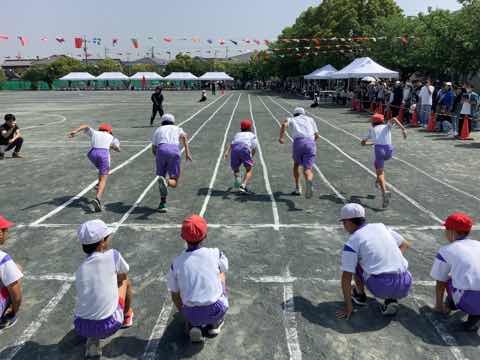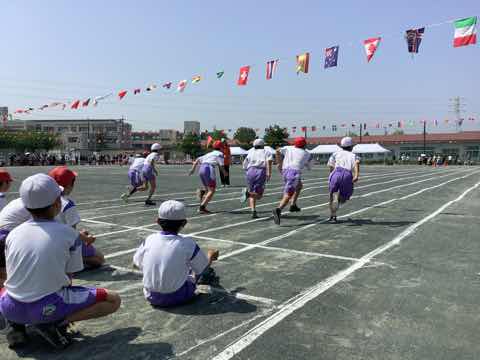 低学年の競技は、玉入れりんピック、徒競走、ダンスです。玉入れりんピックは、ジェンカを踊り、先生の合図で玉入れをしました。青空に子供たちが投げた玉が飛び交いました。 1年生は、入学して初めての運動会です。短い練習期間でしたが、少しずつ内容を増やして、全ての競技で先生の号令に合わせて動けるようになりました。2年生は、さすが2回目です。どんなことをやるのか見通しをもち、迷いなく動けました。一年の成長を感じました。 クラス毎に競ってわくわくした玉入れりんピック、力いっぱい走った徒競走、元気に楽しく踊ったダンス、どれも、小さな体で精一杯できました。