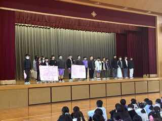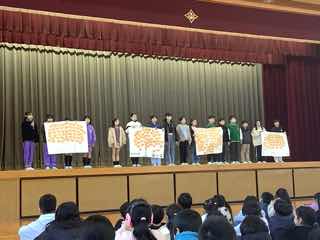 児童会の企画「思いやりの木」の活動について、全学級が舞台上で発表しました。