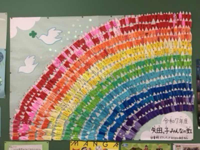 図書館ボランティアさんが開いてくれた「折り紙教室」で子供たちが作った「色鉛筆」が、モザイクアートの「虹」になりました。図書館前に飾られています。懇談会等で来校の際、ぜひ足を伸ばし、見ていってください。図書館ボランティアのみなさん、ありがとうございました。