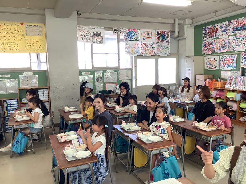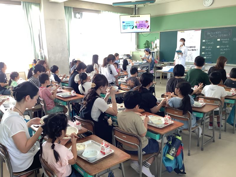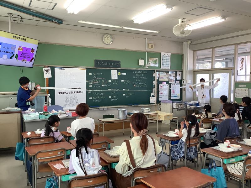 1年生では、9月18日、19日、25日、26日と親子給食会がありました。 子どもたちは、お家の人と給食を食べられてとても嬉しそうでした。栄養教諭から給食に関する貴重な話も聞くことができ、思い出に残る親子給食会になりました。