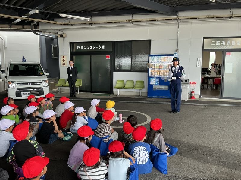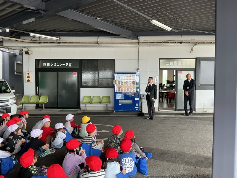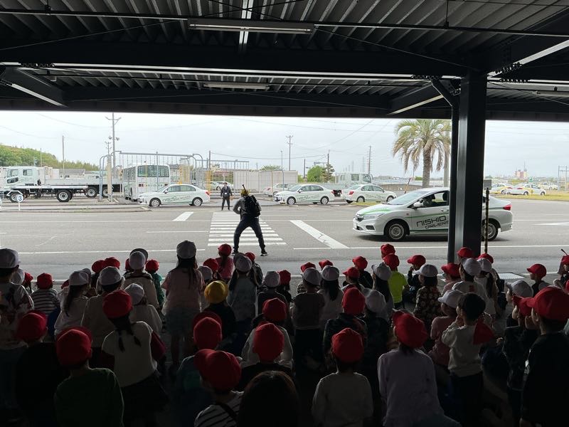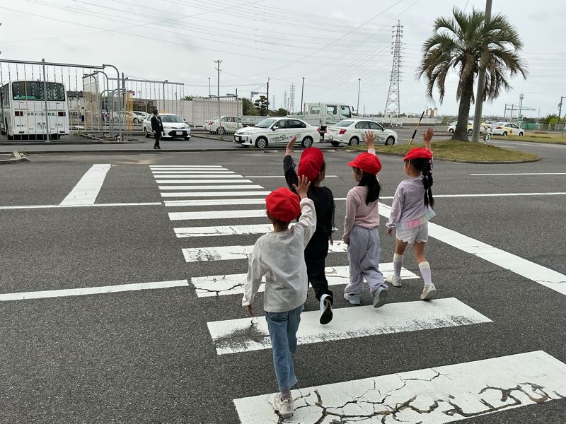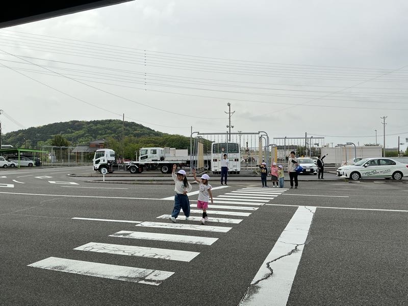 西尾自動車学校へ交通安全教室に行きました。横断歩道を歩くときは、しっかり手を上げて車が来ていないか右、左、右を確認します。
