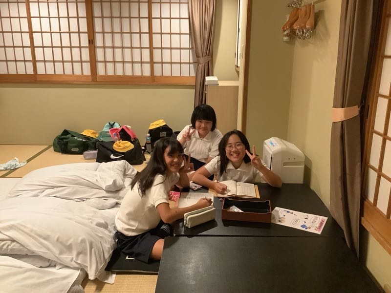 バスに揺られて数時間、大きな学びとたくさんの思い出を詰め込んだ修学旅行を無事に終えることができました。バスから降りるとさすがに疲労の色が見えましたが、どこか晴れやかで充実した2日間であったことを物語っています。そして出迎えの先生に向けて、「ただいま」と挨拶。最後まで切り替えをわすれずに帰着式を行いました。