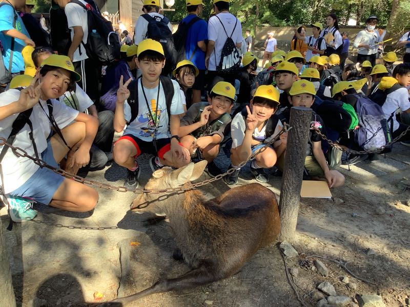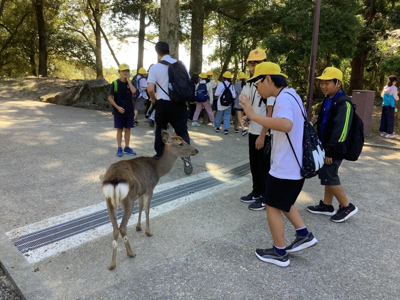 昼食を終え、いよいよ奈良公園に到着しました。早速鹿がお出迎えしてくれ、子どもたちは大興奮です!マナーを守るよう注意しながら楽しんでいます。そして、二月堂・三月堂を通り、大仏殿へ。間近で見る大仏殿の大きさに圧倒されました。