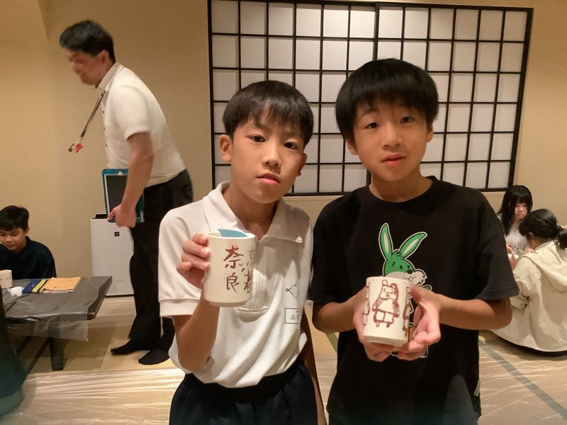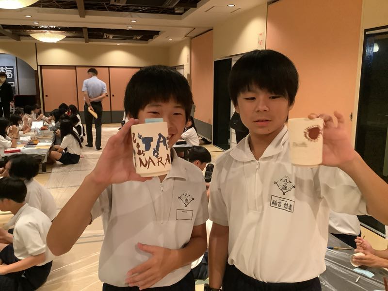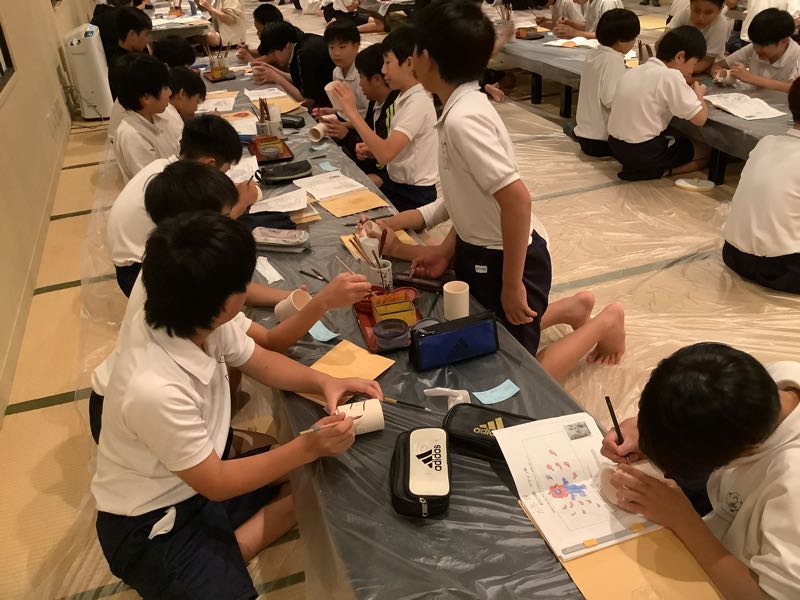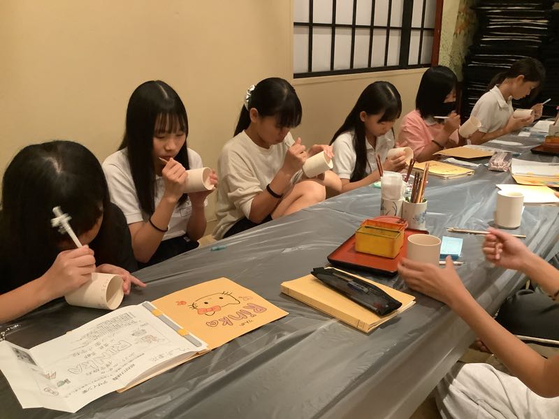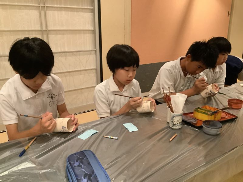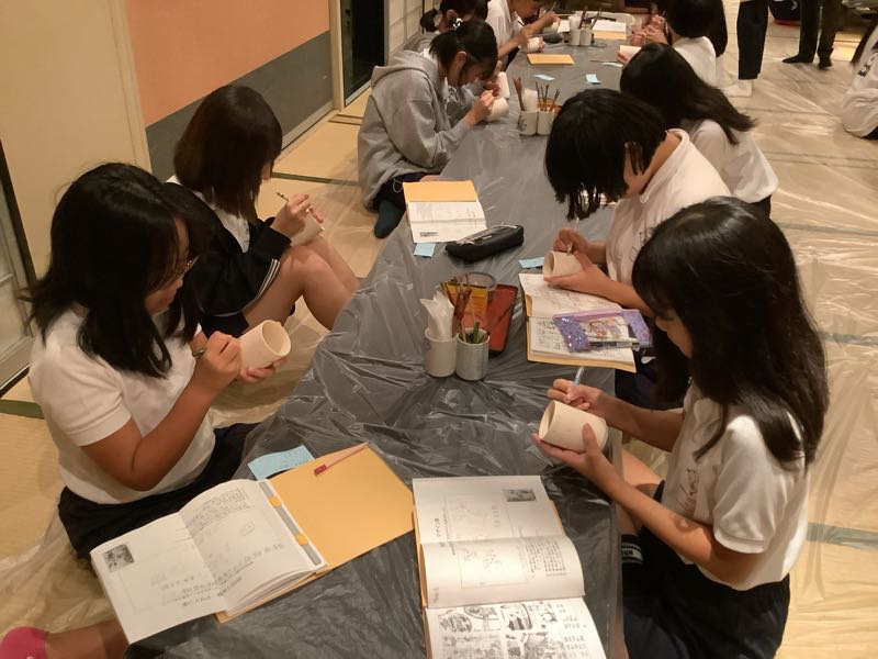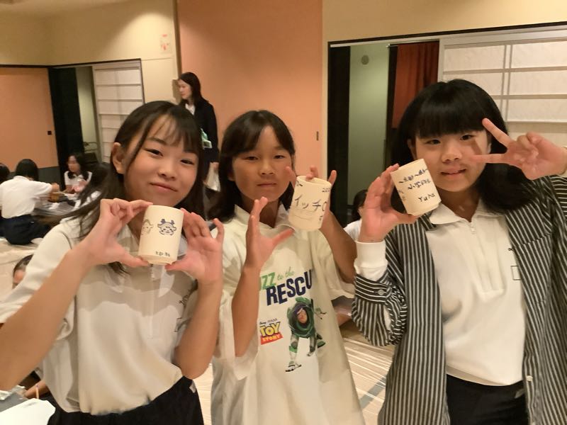 夕食と入浴を終え、体も心もすっきりしました。畳の上では、友だちとおしゃべりが始まっています。そして今夜は絵付け体験に挑戦しました。自分の名前を入れたり、ユニークなキャラクターをかいたり、綺麗な模様をえがいたり、個性あふれる作品が次々と作り出されています。