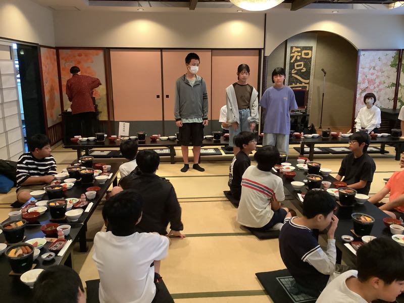 1日目の全ての見学工程を終え、京都に入り、無事「旅館こうろ」に到着しました。旅館の方々から温かいお出迎えを受け、元気な顔で玄関へ入っていきました。そして夕食です。豪華なメニューに目を輝かせ、今日の思い出を楽しく語り合っています!