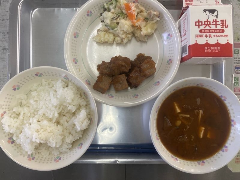 【献立】ごはん、牛乳、サイコロステーキ、和風ポテトサラダ、冬瓜のみそ汁サイコロステーキは6年B組からのリクエストです。どのクラスでも、おかわりの行列ができていました。
