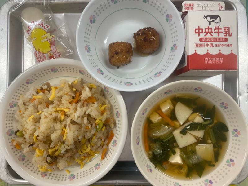 【献立】ツナちらし寿司、牛乳、つくね、豆腐のすまし汁、月見団子今日は十五夜です。給食では月見団子が出ました。子どもたちは、もちもちの月見団子を喜んで食べていました。