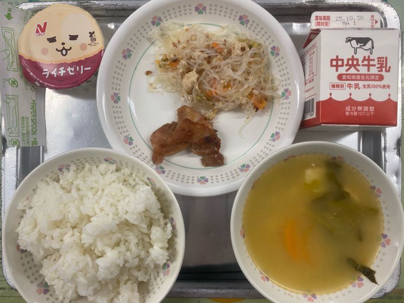 【献立】ごはん、牛乳、ガイヤーン(タイの鶏肉の照り焼き)、ヤム・ウンセン(タイのアーモンド入り春雨サラダ)、トムヤムクン風スープ(タイの酸っぱくて辛いエビ入りスープ)、ライチゼリー今日の給食はタイ料理でした。子どもたちは、異国の味に驚きながら、おいしそうに食べていました。