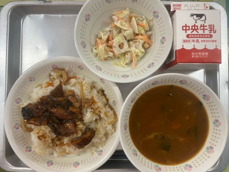 【献立】一色うなぎの混ぜごはん、牛乳、ごまネーズ和え、里芋のみそ汁今日の給食は、一色産のうなぎを使った混ぜごはんでした。年に一度のスペシャルメニューに子どもたちも大喜びでした。