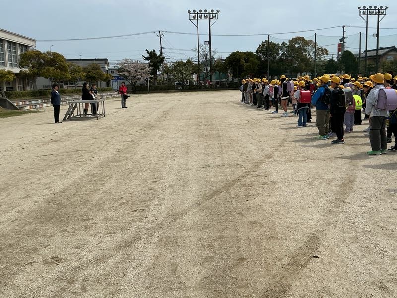 通学団会の後の一斉下校では、先生たちと一緒に帰りました。4月中はみんなで一緒に帰ります。この間に通学路を覚えましょう。