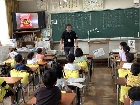 今日は前回の吉田保育園の子に引き続き、離島保育園の年長さんが1年生の授業に参加してくれました。1年生の子も2回目ということもあり、ちょっと余裕があるように見えました。離島保育園の子も楽しんでくれていたようでした。