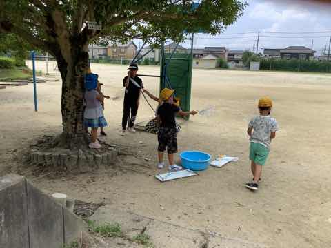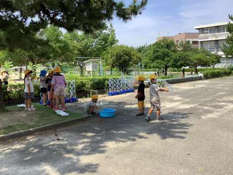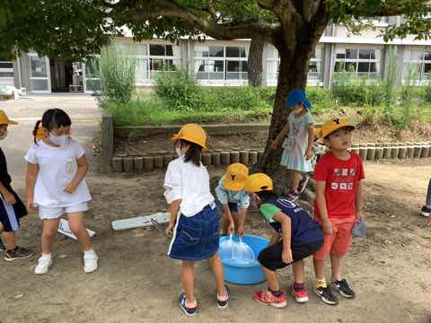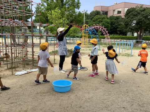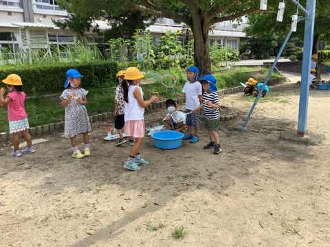 吉田保育園の年長さんと一緒に1年生が学習した「シャボン玉づくり」を行いました。 保育園の子にシャボン玉づくりのコツを教えてあげながら、一緒に楽しむことができたかな。