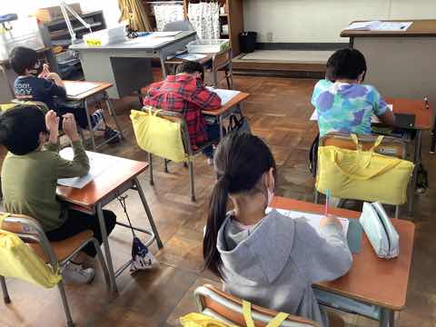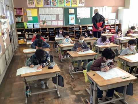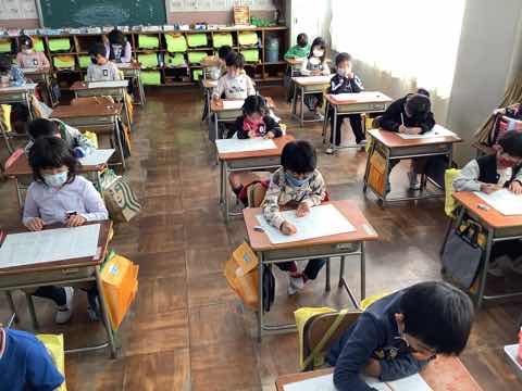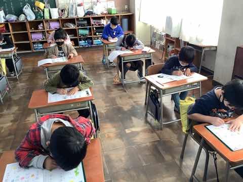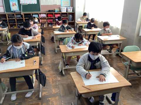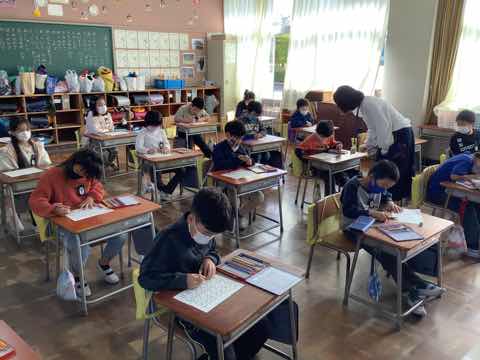 英語で色ぬり、書写で全体の形を意識して書く練習をしていました。発表会練習と普段の授業を両立させながら頑張っています。