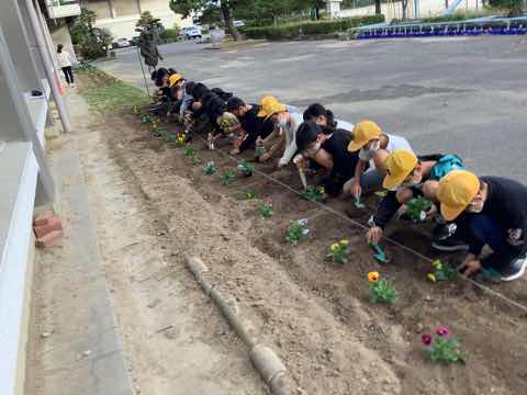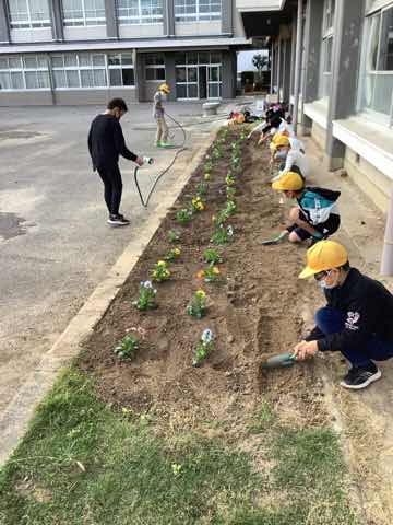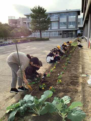 緑化委員会で花壇に4色のパンジーを植えました。春までしっかりお世話をしてきれいな花をたくさん咲かせたいです。