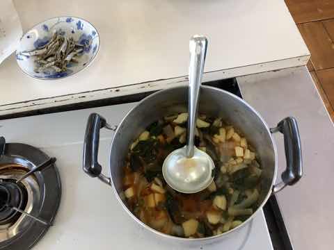 煮干しでだしをとっての味噌汁作り朝、煮干しの準備から始めます。具材は各班で3つずつ決めました。試食では、だしの入ってないみそしると味比べをして、その違いにびっくりだしは絶対必要と言っていました。