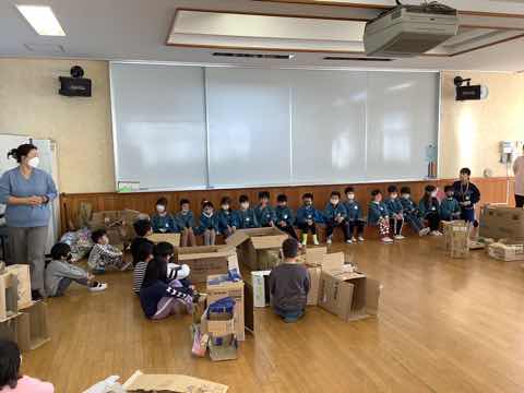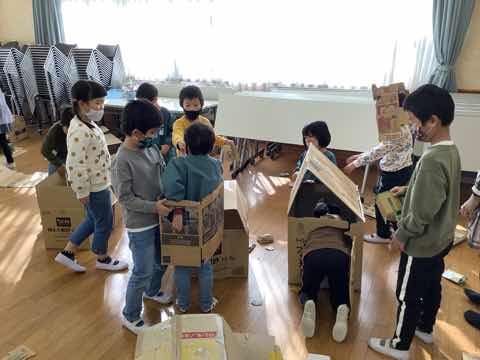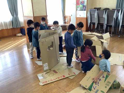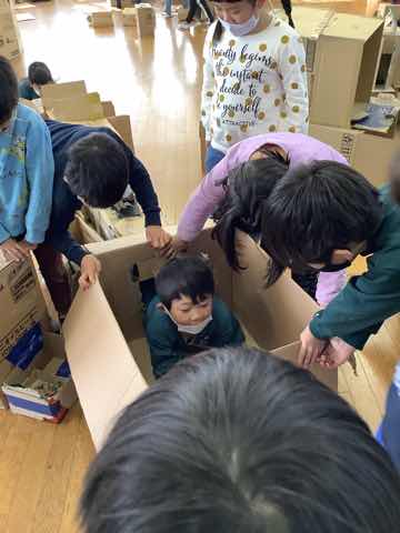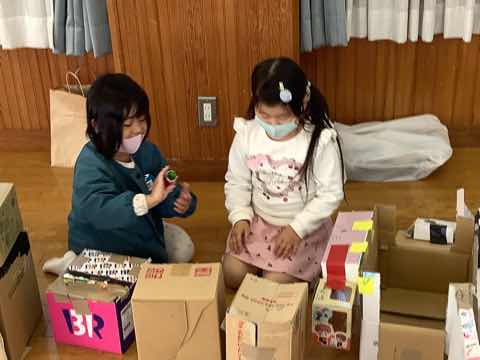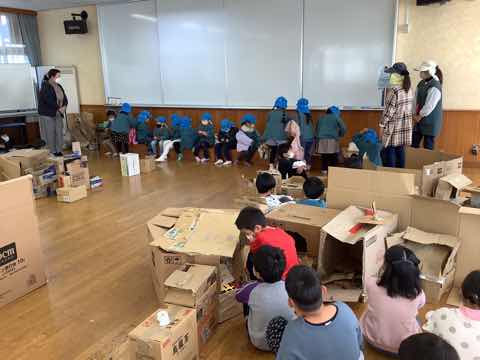 昨日と同様にチューリップの植え付けをし、次にダンボールを使ったおもちゃで一緒に楽しんでいました。