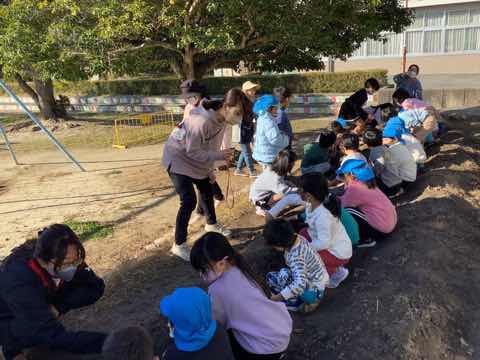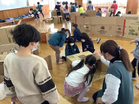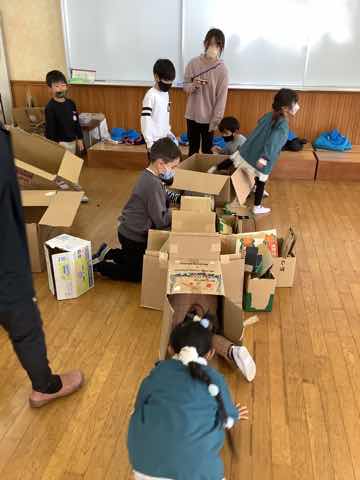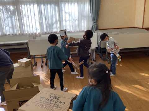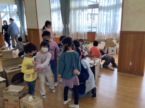 離島保育園の年長児と1年生が交流会を行いました。①チューリップの球根を植える②ダンボールで作ったおもちゃで一緒に遊ぶを行いました。