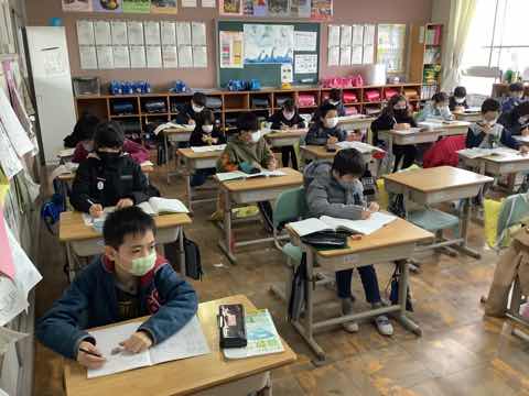理科の授業の4の1、密にならないように教室で音楽の記号を学ぶ4の2。