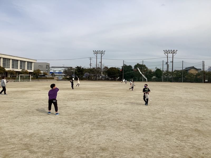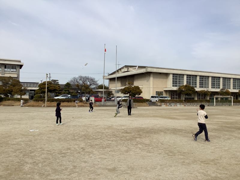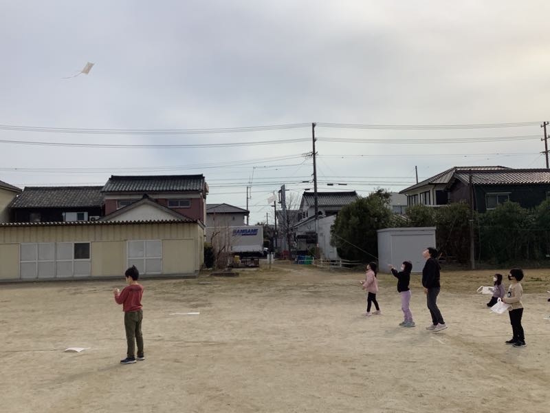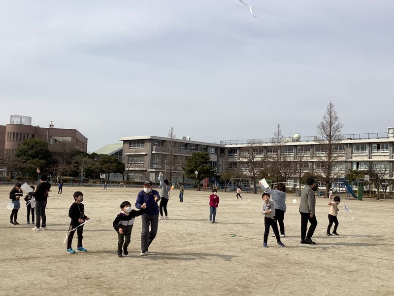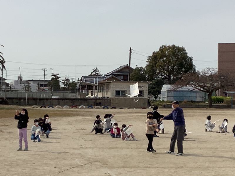 2年生が思い思いに描いた絵を、地域の凧あげ名人の方が凧に作り上げてくださいました。高くあげるこつを教えてもらい、さあ凧あげに挑戦。今日はあまり風が強くありませんでしたが、糸を上手に動かしたり、走ってあげたりとより高くあげる工夫をしていました。走り回って汗をかいている子もいました。いい体験ができました。