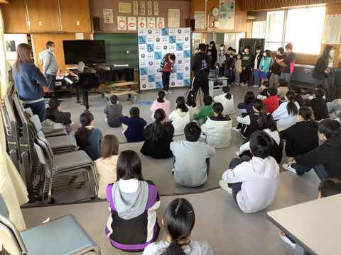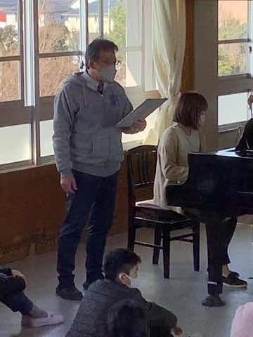 今朝は今年度最後の全校朝会がありました。今日は音楽室を利用して、卒業していく6年生を招いて行いました。