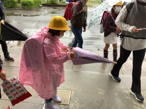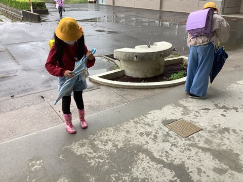 今日は朝から雨でした。傘をさしたり、カッパを着たりして登校しました。それでも、ちょっと濡れてしまった子もいたようです。