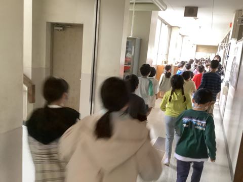 不審者が来たことがわかったら、急いで避難します。避難中は、しゃべりません。みんな、黙っています。慌てると、けがをしてしまうかもしれません。急いで、でも安全にも気をつけて避難しました。