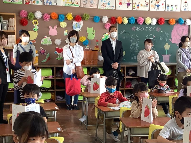 みんなで集まることはまだできないので、校長室からテレビ放送で行いました。今までの感謝の気持ちを手紙に書いて、花束と一緒に渡しました。