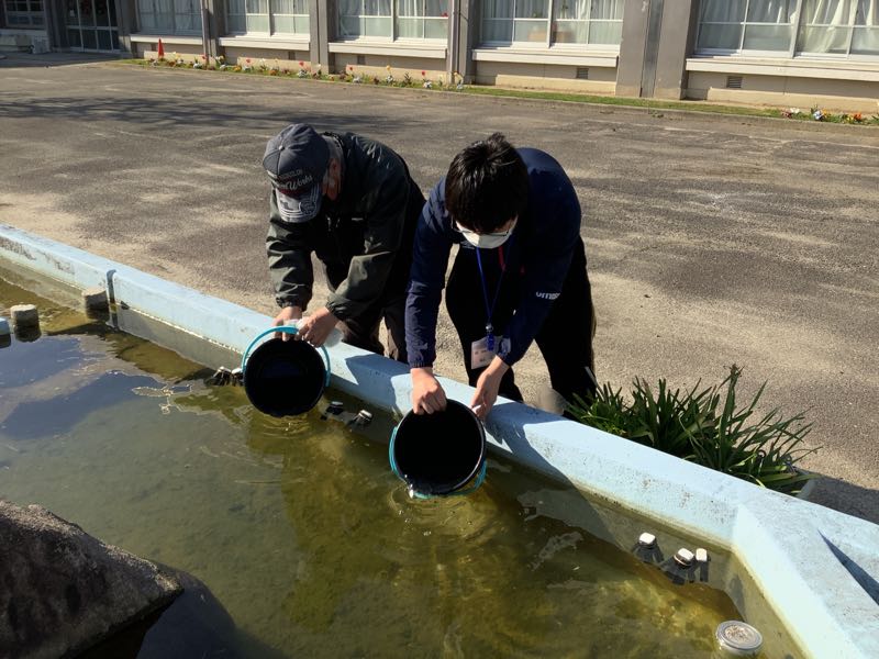 校庭の池にメダカの仲間が増えました。地域の方が新学期を迎える吉田小学校に寄付してくださいました。赤色のメダカが増え、池がにぎやかになりました。ありがとうございました。メダカも、吉田っ子の登校を心待ちにしています。