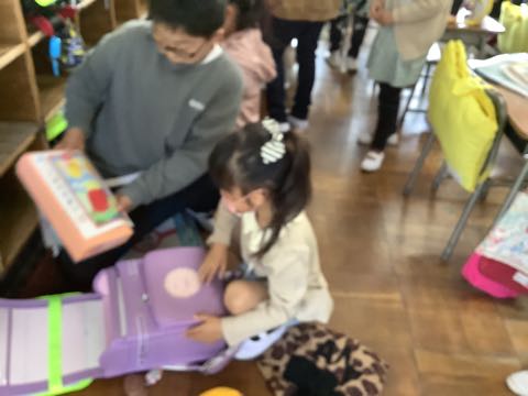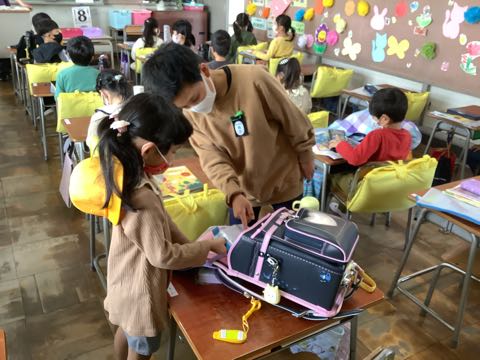 ランドセルから用具を出すのも初めてです。今日は六年生がお手伝いをしてくれました。