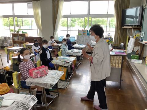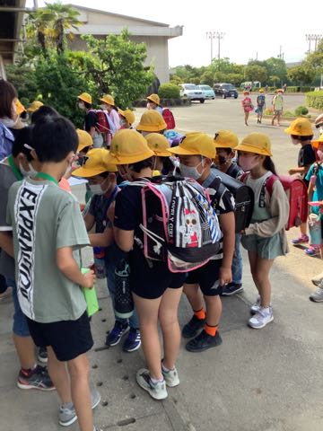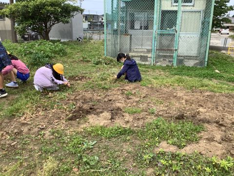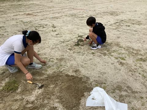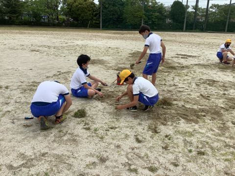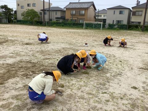 家庭科の学習で、「学校で汚れているところ」を探したら、「運動場に草がたくさんあって汚れている」という意見が出て、草取りをしてきれいにしようということになりました。