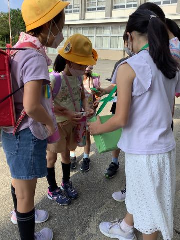 緑化委員会が昇降口に立ち、募金をしてくれた子に緑の羽根を渡します。