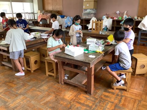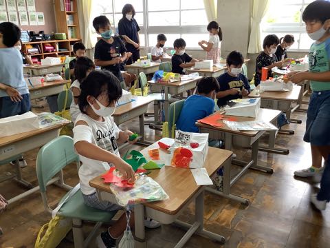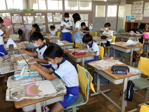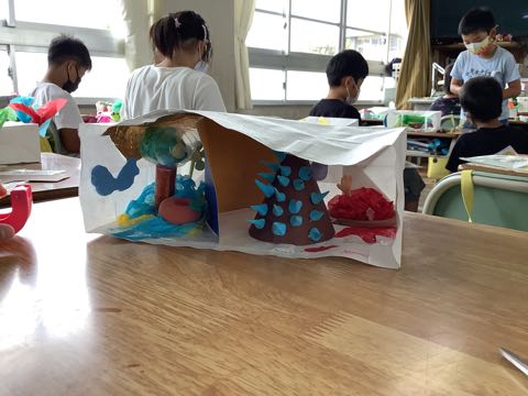 3年生は、図工の授業で、ふくろの中に素敵な世界を作っています。「ふくろの中は海だよ」、「おいしそうなスイーツの世界を作っているよ」、「遊園地になっているよ」など、思い思いに楽しい世界を思い浮かべながら、作成することができました。
