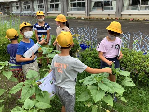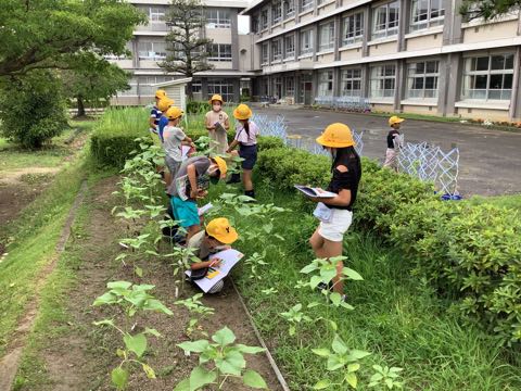 理科の授業では、それぞれの学年が観察を行いました。3年生は、ヒマワリとホウセンカを観察しました。ずいぶん大きくなったヒマワリの茎や葉をさわって、手触りを実感しました。