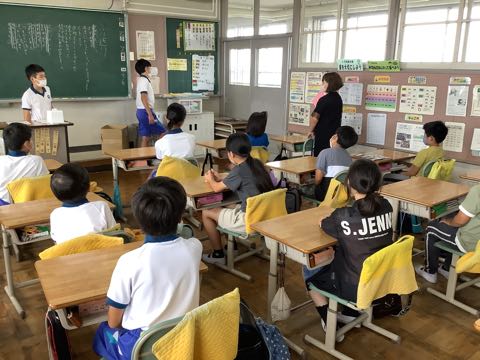 1年生は、育てているアサガオの花を、5年生の理科の授業の教材として寄付しました。5年生は感謝の気持ちを伝えるために、1年生の教室にやってきました。