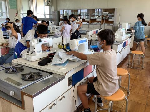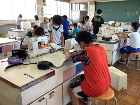 家庭科の授業の様子です。6年生は、ミシンを使って手さげ作り。最後の段階で、持ち手を縫い付けていきます。完成をした子もいました。