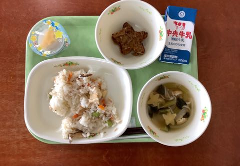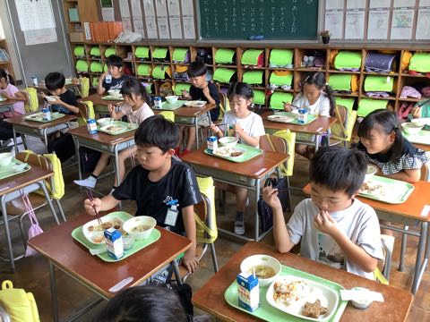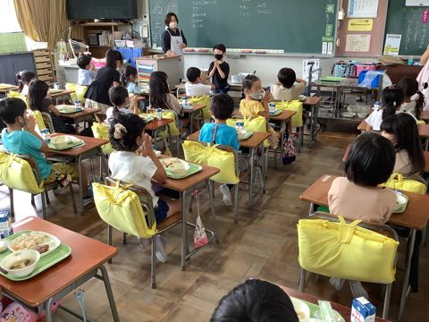 今日は七夕です。給食は、ちらし寿司、お星さまハンバーグ、七夕汁、七夕ゼリーと七夕メニューでした。吉田っ子は、お星さまがたくさんちりばめられた給食を楽しみました。