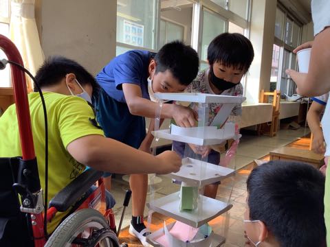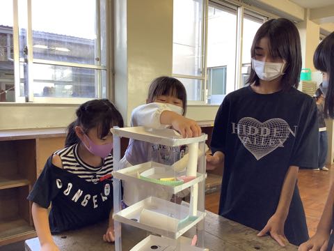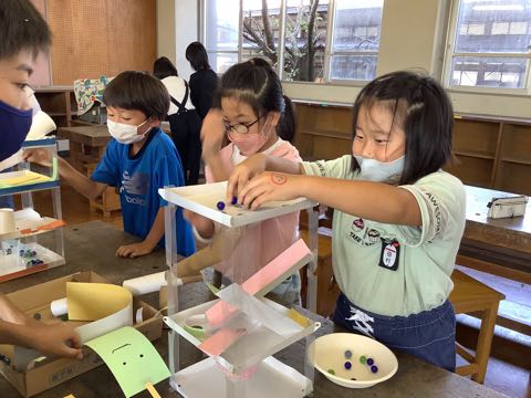 5年生が図工の時間に作成したおもちゃ「コロがるくんの旅」で遊ぶ会に、2年生が招待されました。2年生は目をキラキラさせながら遊んでいました。5年生が作ったおもちゃには、その子なりの工夫とグループによる協力の成果があらわれていて、ビー玉の転がり方がとても楽しかったです。2年生と5年生の和気あいあいの笑顔が見られ、すてきな時間となりました。