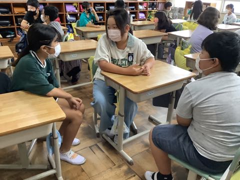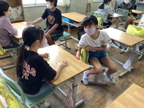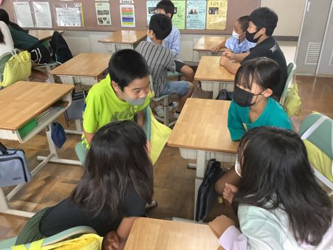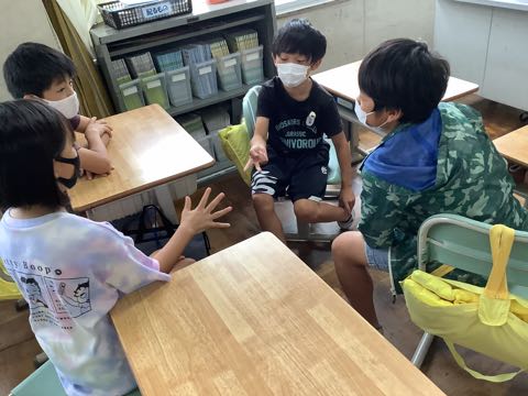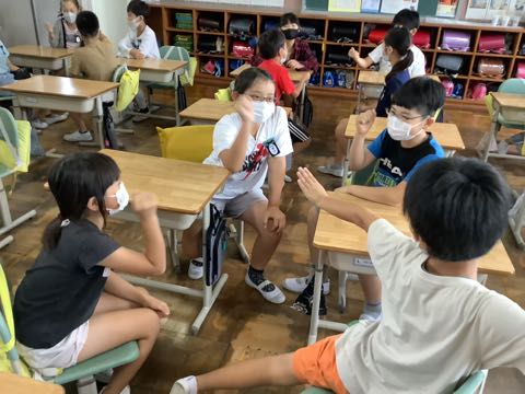 今日の朝は、よしよしタイムでした。今回は「質問ジャンケン」です。4人グループの中で2人組をつくってジャンケンをし、勝った人が負けた人に質問をしていきます。