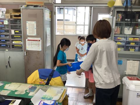 職員室に、スイーツをもらいにきました。なんだかみんな、うきうきした様子。そして、それぞれの教室で「いただきます」です。