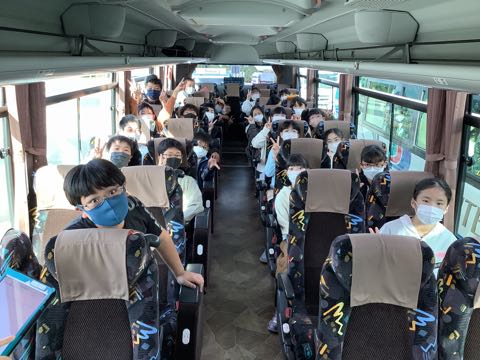 バスの中から見える景色を楽しんだり、友達とおしゃべりをして過ごしています。天気が良いので、遠くまで景色がよく見えます。