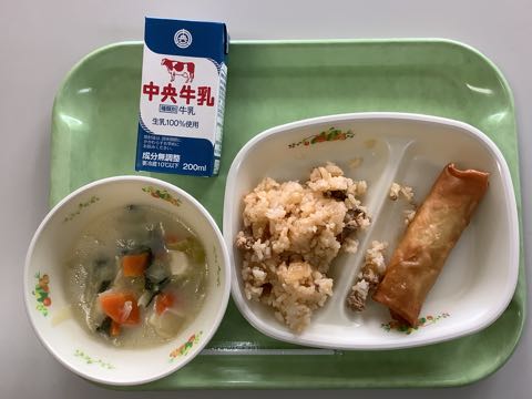 キムチチャーハンと春巻き、豆乳中華スープでした。