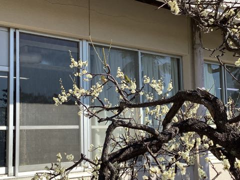 校長室の南にある梅の木にメジロがやって来ました。梅の花の蜜をすっています。
