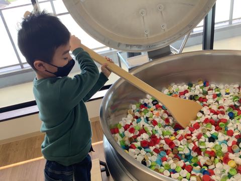 大きなお鍋に入っているおかずを混ぜる体験をしました。