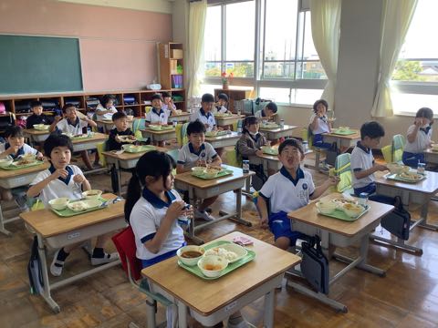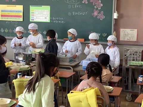 1年生も給食当番をがんばって、みんなで給食の準備をしました。