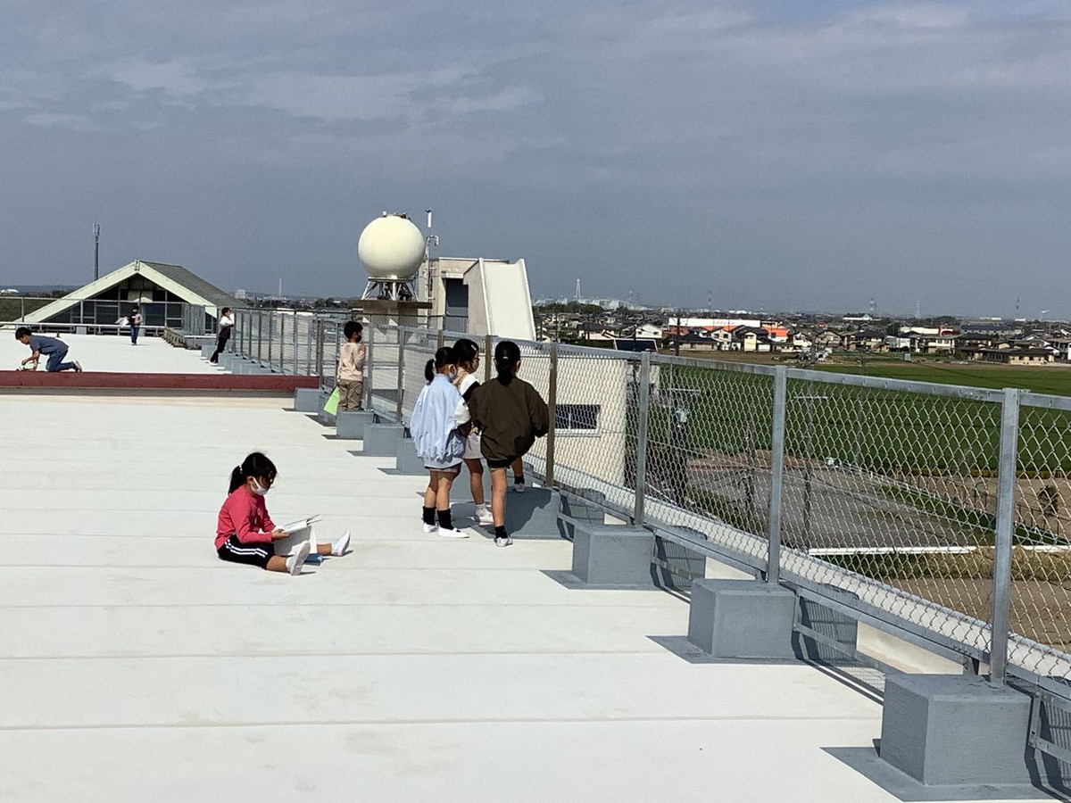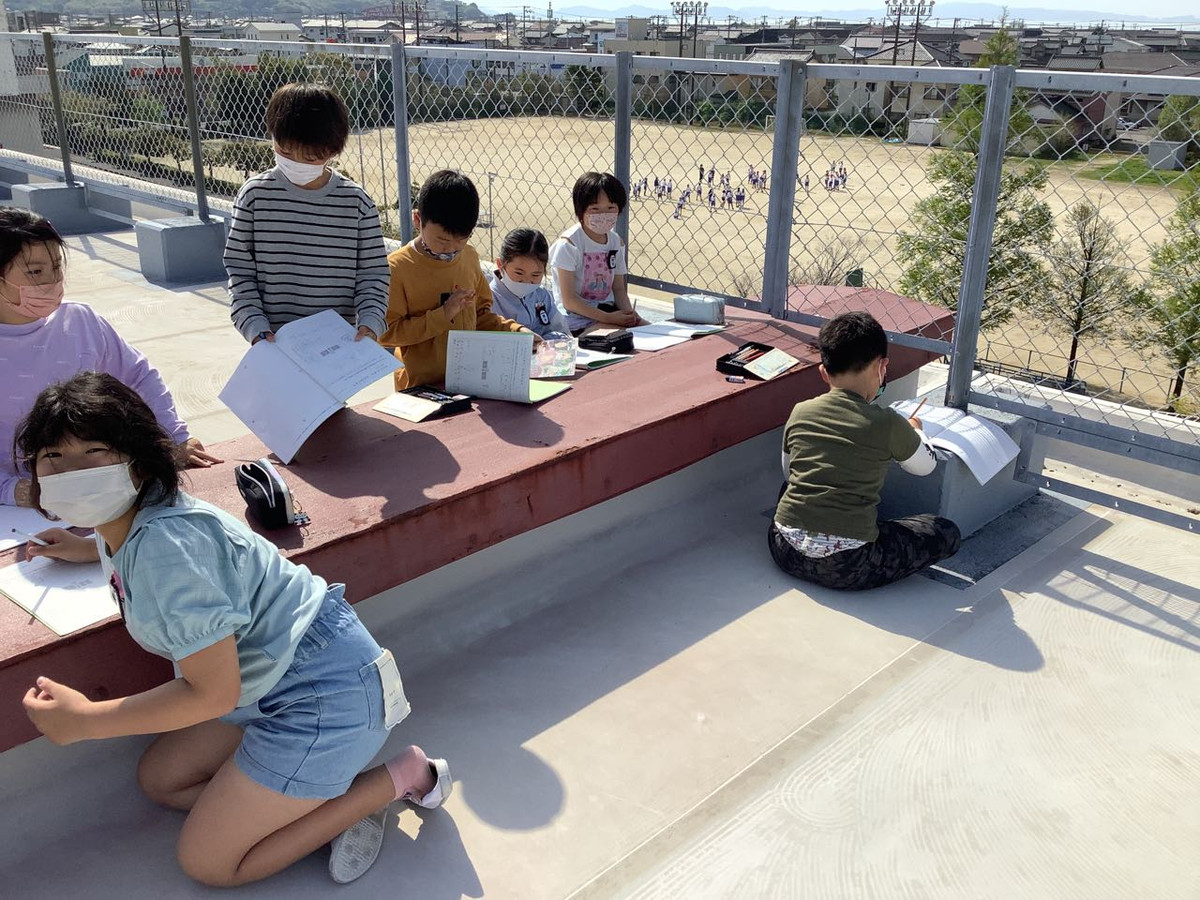 3年生は社会の勉強が始まりました。学校の周りにはどんなものがあるか、屋上に上って見てみました。学校の周りにあるお店や施設を見つけることができました。