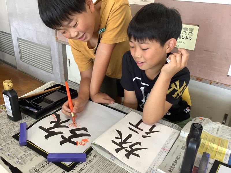 ペアで見合い、朱筆で良いところに丸をつけながら学び合いました。
