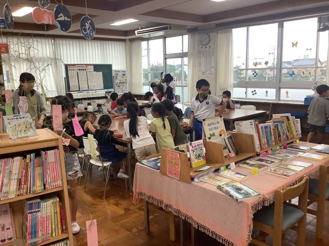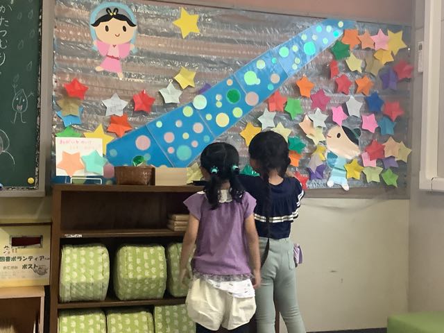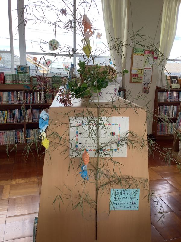 七夕の日を前に、図書ボランティアの皆さんが七夕飾りを用意してくださいました。今日のお昼の放課には、たくさんの吉田っ子が図書室へ訪れ、短冊に願い事を書いていました。「元気でいられますように」「ケーキ屋さんになれますように」・・・願い事がかなうといいです。