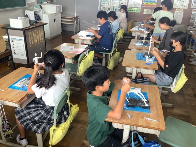 5年生は、家庭科で針と糸を使って、自分の名前を縫い付けたり、ボタン付けをしたりしました。なかなかうまくいかず、苦戦しています。