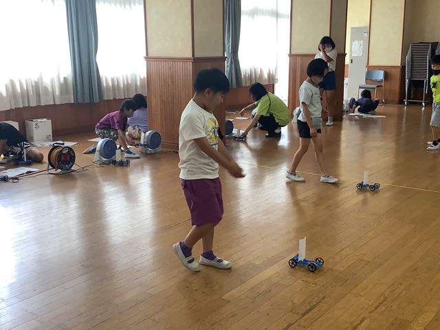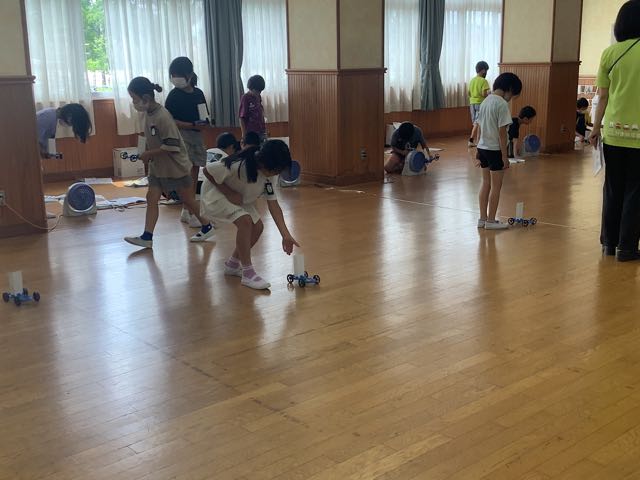 風ににはどんな力があるのか、3年生が実験で調べています。強い風と弱い風では、車の進み方が違うのでしょうか?