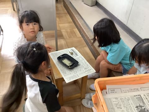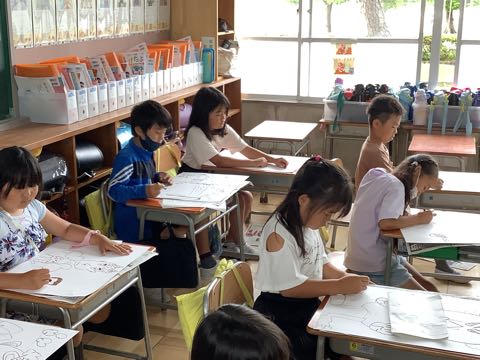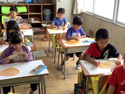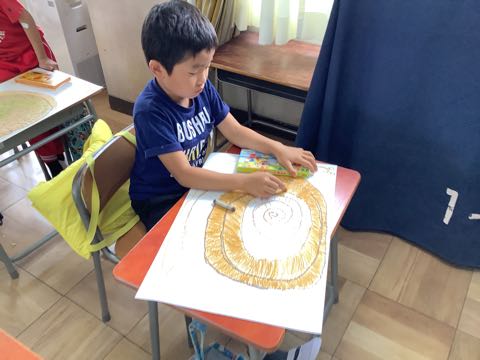 1年生は、カタツムリを描いています。うずまきの殻を、工夫して色塗りしています。